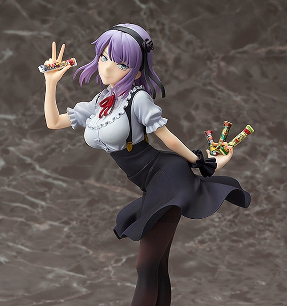 Her striking purple hair makes use of translucent ends which faithfully capture the vivid yet almost see-though appearance and texture of her hair. She holds a number of Umaibo – the so-called ‘King of Cheap Sweets’ – in her hands with a huge smile on her face, ready to be added to your figure collection!